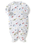 Kissy Kissy white pima cotton snap footie with allover airplane print.