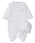Kissy Kissy pima cotton white snap footie with moon & stars embroidery + coordinating baby beanie (2-piece set).