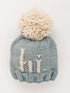 What a cute way to greet the world! Our Huggalugs beanie is hand knit in cozy Rosy pink hued yarn with the word 'hi.' in natural colored yarn.
