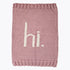What a cute way to greet the world! This rosy pink blanket is hand knit in cozy Icelandic Acrylic yarn with the word 'hi.' in duplicate stitched in natural colored yarn. This is perfect for hospital and first photos and makes a wonderful baby shower gift. Get our matching hi. beanie for a complete set. Blanket measures 18" x 24"