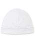 Kissy Kissy white pima cotton baby beanie hat with allover light blue dot print & blue picot trim.