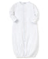 White pima cotton converter gown with allover light blue dot print & blue picot trim.