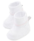White pima cotton baby booties with allover pink dot print & pink picot trim.