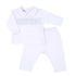 Magnolia Baby white pima cotton pant set with light blue smocking. This brand tends to run small, so consider sizing up.