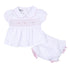 Magnolia Baby white pima cotton diaper set with light pink smocking. This brand tends to run small, so consider sizing up.