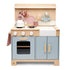 Included in this set are a solid wood white kettle, 2 cups and saucers, 3 utensils and utensil holder, a printed gingham tea towel, a soap, a slicing baguette, and an oven tray that can also be used to cover the sink area and provide an extra work surface for pretend play.