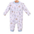 Trotter Street white long sleeve romper for baby boys with light blue trim & allover party animals print.