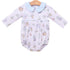 Trotter Street white long sleeve bubble for baby boys with light peter pan collar & allover party animals print.