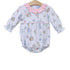 Trotter Street white long sleeve bubble for baby girls with light pink ruffle collar & allover party animals print.