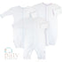 Solid white signature, 50/50 blend, Paty knit accented in colored picot trim. This style can be converted from a gown to a romper, providing versatility & easy transition to the carseat or stroller.