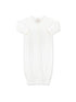 The Snuggle Me Saque Gown in Park White knit is a soft, comfortable gown adorned with ecru featherstitching and picot trim to give it an elegant touch. Designed for ease and comfort, the gown provides a snug fit while allowing room for movement, making it ideal for nap time or special moments.