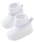 White pima cotton baby booties with allover light blue dot print & blue picot trim.